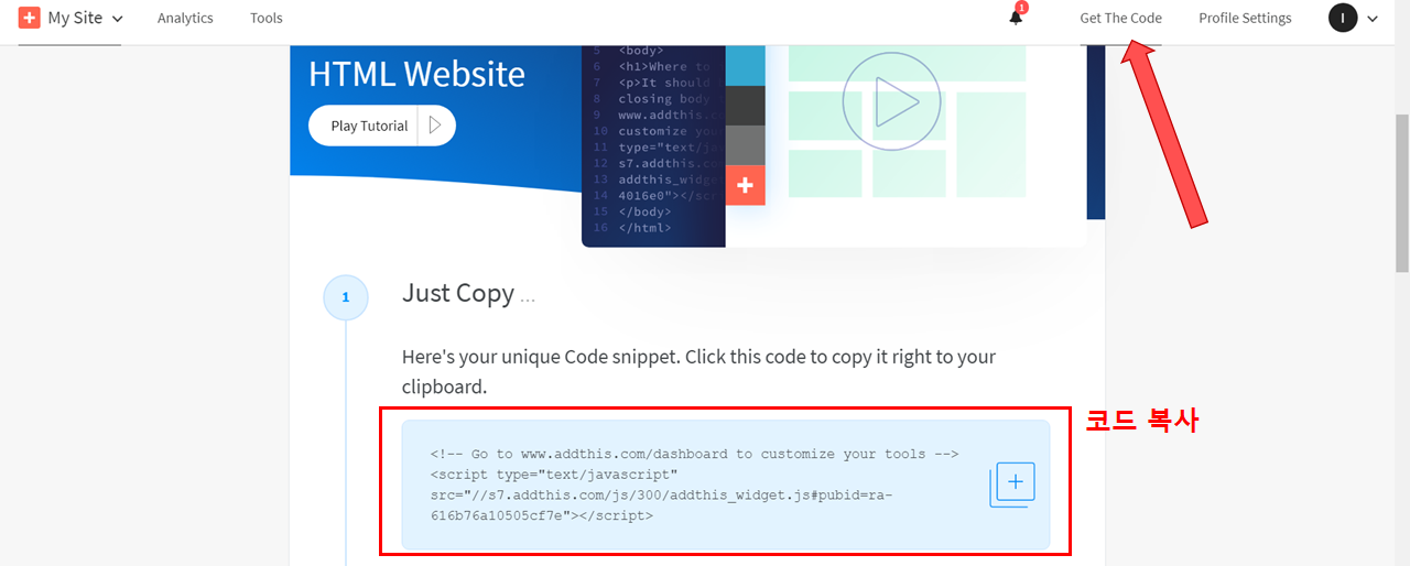 가입을 했으면 Dashboard - Get The Code를 눌러서 스킨 편집에 삽입할 코드를 복사할 수 있다.