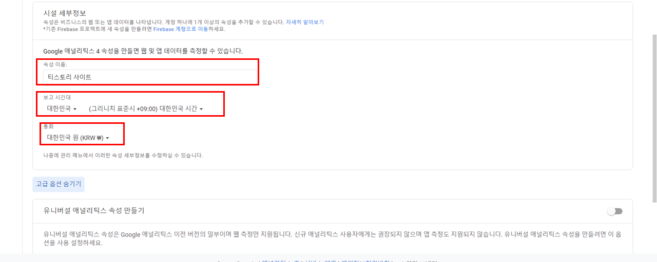 이 때, 고급옵션의 "유니버셜 애널리틱스"의 설정 부분이 중요하다.