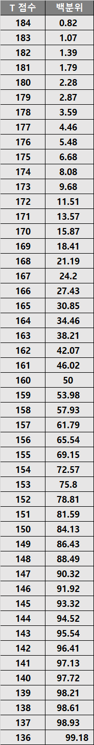 위에서 보다시피 T score와 백분율은 1대1 대응이 된다.