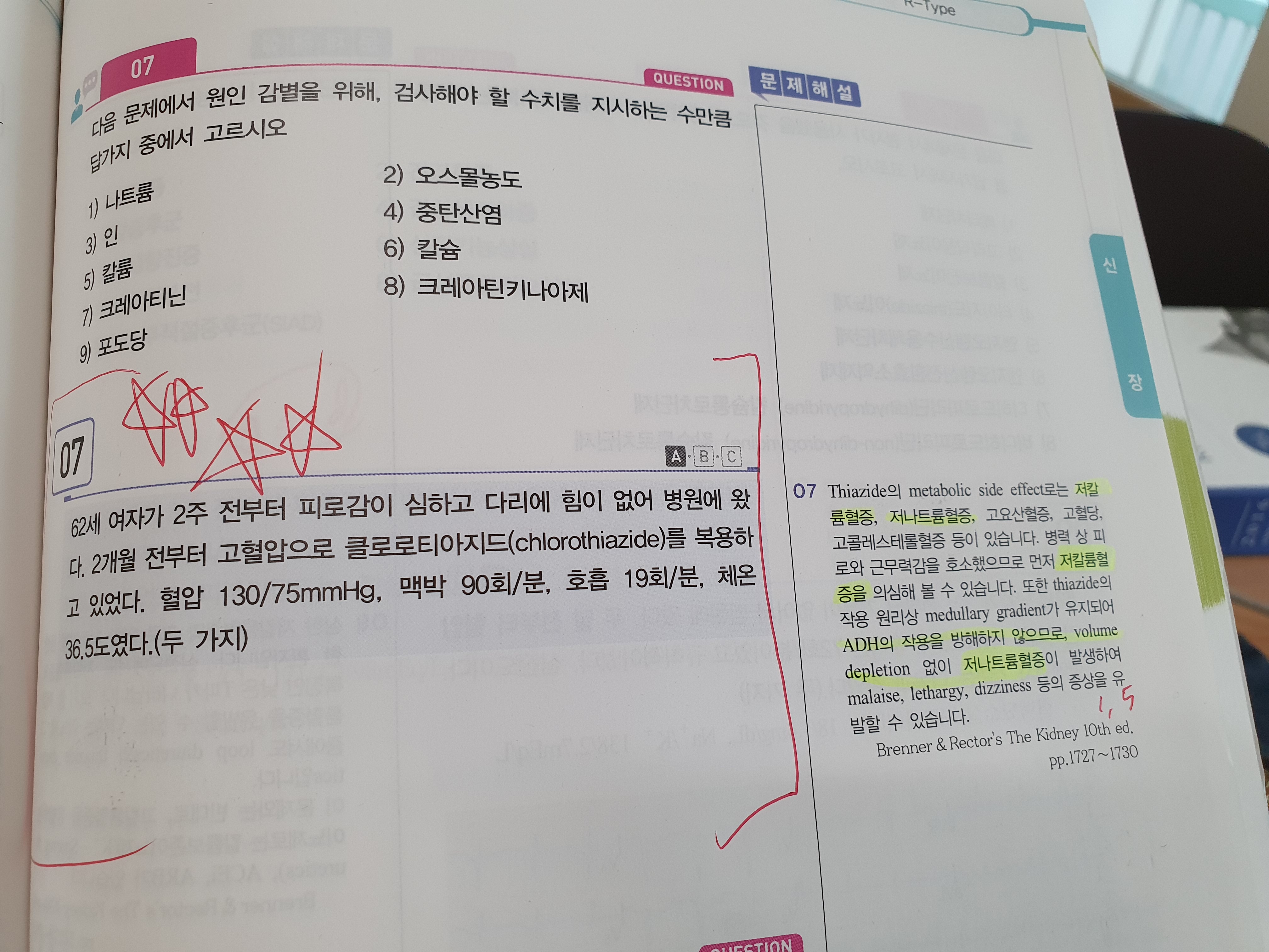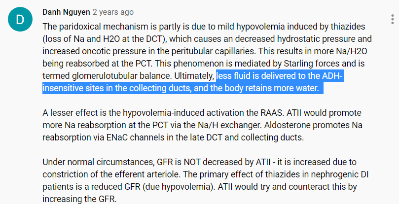 Thiazide 절대적 금기통풍 고혈압, with ARB 또는 CCB (특히 ARB ACEi Spironolactone 으로 hyperkalemia 생겼을 때) Nephrogenic Diabetes Insipidus (Central은 아님) - 일차치료는 저염식, 그 이후치료소변의 양 = 소금의 양. 소변을 줄여야 하므로 저염식을 한다. thiazide 이뇨제 치료의 원리: ADH sensitive site로 가기 전 proximal에서 water reabsorption을 늘리는 것..? 족보 콩팥결석 있을 때 칼슘배설 줄이는 목적으로 줄 수 있다. thiazide 투여하면 hypokalemic alkalosis 뿐만 아니라 hyponatremia 유발한다 (ADH 방해하지 않으므로 water는 그대로 재흡수함 → 저나트륨혈증) thiazide가 답인 경우