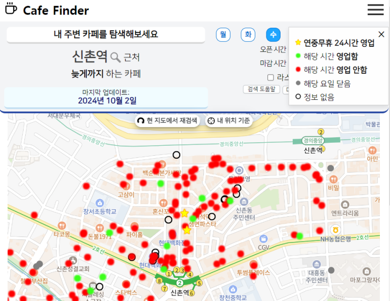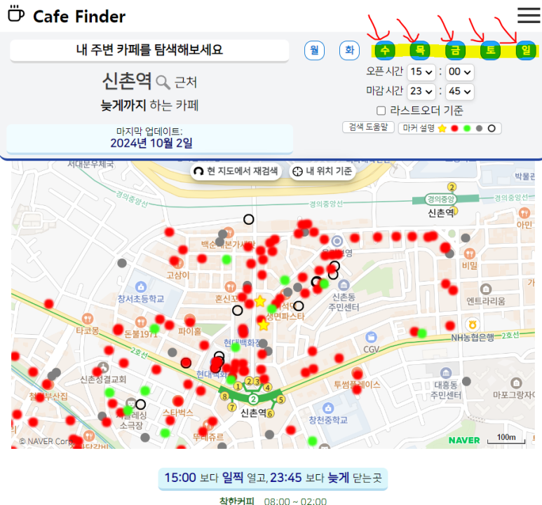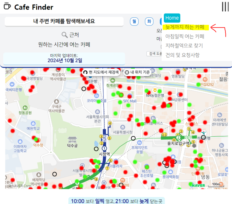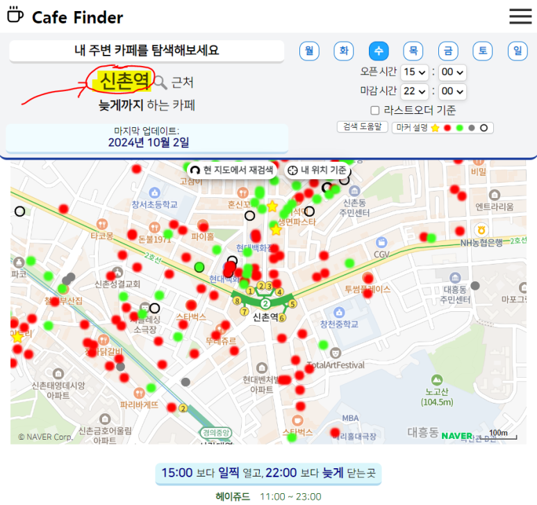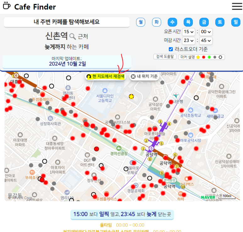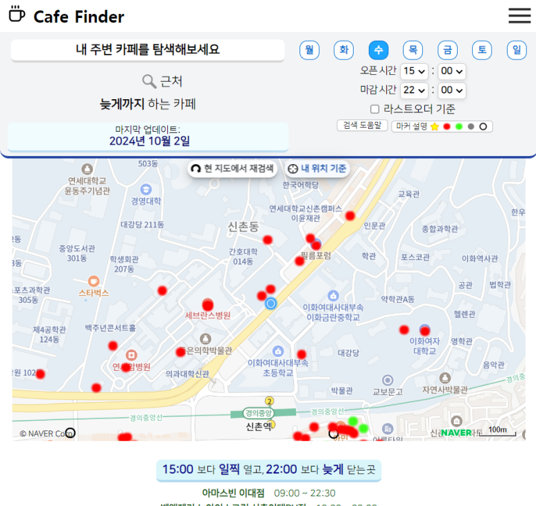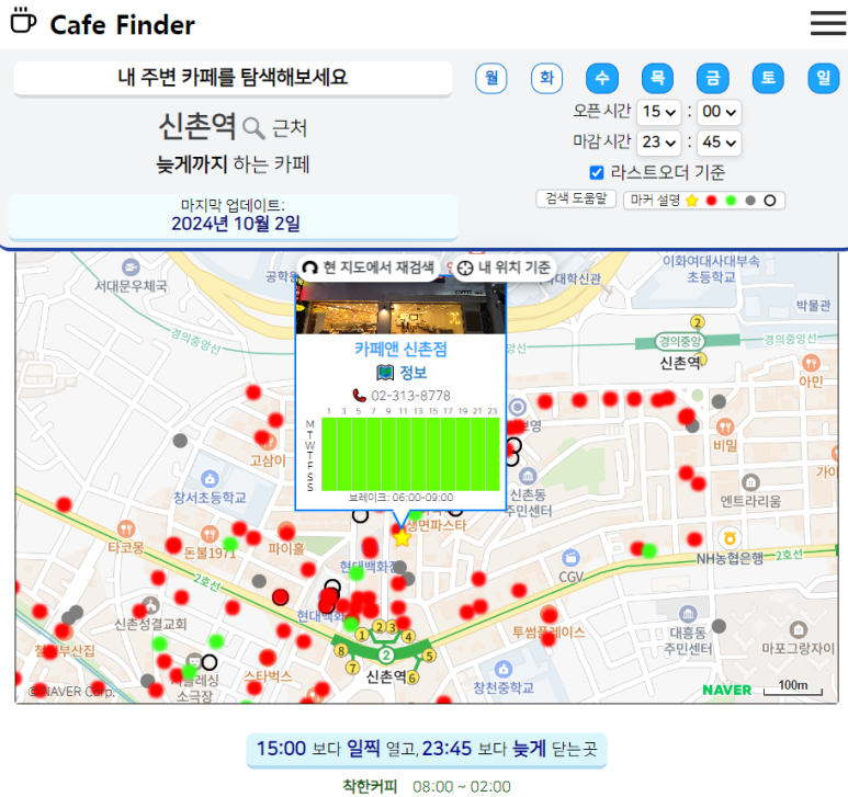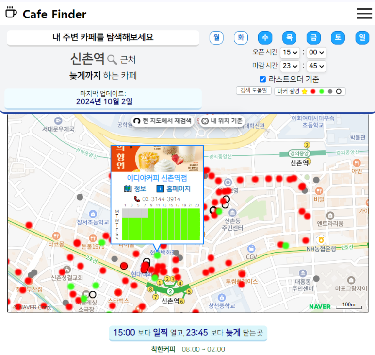 이렇게 오픈&마감 시간을 설정하고 나면, 해당하는 카페들이 보기 쉽게 표시 된답니다.