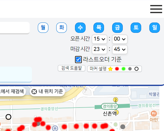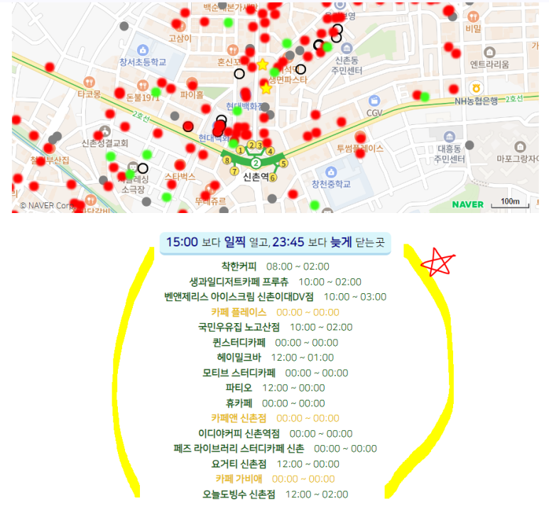 빨강색 동그라미는 설정된 시간에 열지 않는 곳이고,