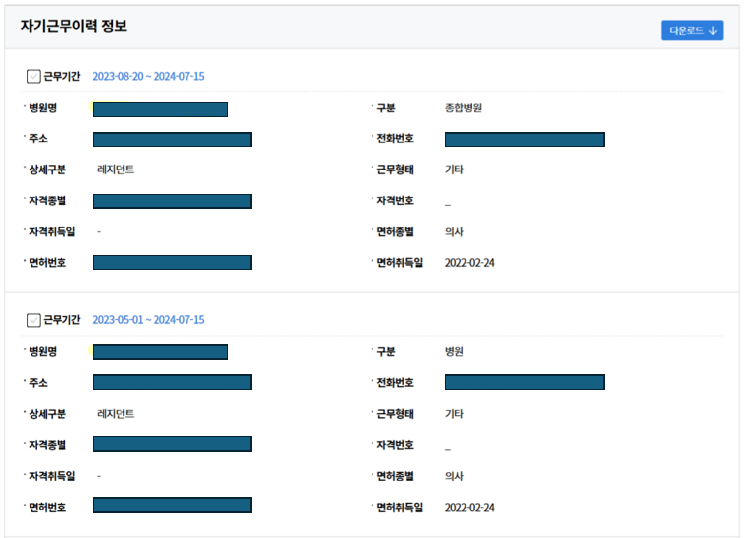 일반적으로 퇴직을 하여 환자 진료 업무에 종사하지 않는 경우라면 건강보험 자격득실확인서를 첨부하면 된다.