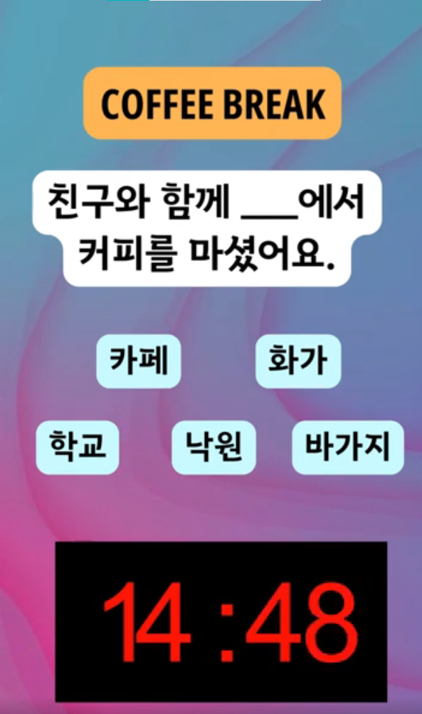 " 안녕하세요 라이프 줌인 (LIFE ZOOM IN) 입니다 "하루 중간에 잠깐 쉬어가서 커피 테마 한국어 언어 퀴즈에 참여해 보세요! 카페인 애호가이든 좋은 커피 한 잔을 즐기는 사람이든, 이 퀴즈는 여러분을 위한 것입니다.한국어 어휘력과 언어 능력을 테스트하면서 가상의 커피 시간을 즐겨보세요. 여러분을 카페인에 충전시켜주고 영감을 주는 재미있고 교육적인 경험에 준비하세요.놓치지 마세요. 지금 재생 버튼을 눌러 함께 퀴즈를 즐겨보세요! 함께 읽으면 좋은 글https://youtube.com/shorts/1630oEWOarE[Korean] - Koreans do not use "-씨"(to call names) that much irl. When to call 언니 or 오빠? It's not rude!